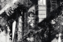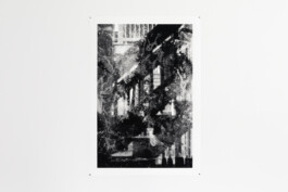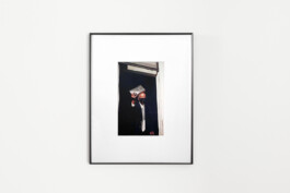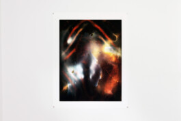 At one end of the spectrum is The Mormon (2021), a tightly cropped, crisp portrait. It shows a young man’s face in three-quarter profile, dressed in a white shirt and black tie, as if a classically seated portrait, but its captured stillness shows the subject in a momentary repose, preparing to respond in debate with the artist as he took the picture. The Mormon is hung above a closed door in the rear gallery wall, in a gesture reminiscent of where one might hang a picture of a saint. The elevated placement of this work frames the exhibition, bringing to bear an interrogation of religion amongst its themes. Black Madonna (2021) is from a recent body of painterly, additive pictures, which are made entirely without film or camera. Applying chemicals to photosensitive paper, which is then exposed to light (and in the case of Black Madonna, following that, exposed to heat), creates splashes, drips, scratches and sprays of color. Black Madonna appears to be illuminated from within; the streaks of color across its jet-black surface are like the celestial Northern Lights or an oil shine on metal. The black and white Mother and Child (2021) is a composite photograph made with a double exposed negative. One exposure is made up of organic patterned passages; the other exposure is of a young girl held tight on her mother’s lap sitting on the wooden back steps of a Chicago brick apartment building. The exposure of the patterned passages is very painterly, which look composed, but is in fact a photograph of paint and water mixing in the bottom of a bathtub blvxmth was using to rinse out brushes. The images streak and shadow across each other in bold diagonal shapes and the young girl’s eyes make contact with the camera. Her mother looks skyward, a worried expression upon her face.