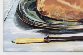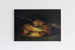 Without the décor, dress and architecture of portraiture and landscape painting, the ordinariness of the objects in these still lifes allows them to travel easily across time. A ham remains a ham. This exhibition puts these paintings together as the humble goods of a table set for dinner. We have ham, fish, lemons, apples and wine, with flowers and some skulls thrown in. If anything, the copies allow the removal of the status of the originals, providing the opportunity to see them anew in Kenny’s embrace, as works of love, the gift of a feast for us to receive. He wants them to pass, but not as forgeries, as he claims these artworks as his own. Painting them with as much fidelity to every brushstroke as he can manage, down to the artists’ signatures, he welcomes that confusion, as their unlikely installation in this setting provokes the question: “What are these paintings doing here?”
