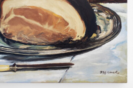 Kenny is perhaps best known for his “Monster Paintings,” a series of paintings depicting the One World Trade building as a cartoon monster looming menacingly, albeit comically, over a hyper-realistic lower Manhattan. Although distinct, the Still Life Paintings share a fidelity to their subjects, a central trait of the artist’s larger project. Kenny’s copies are nearly indistinguishable renderings of lesser-known works by master artists including Francisco Goya’s Still Life with Golden Bream (1808-1812), Claude Monet’s Red Mullets (1870), Edouard Manet’s The Ham (1875-1878), Paul Cézanne’s Still Life with Apples and a Glass of Wine (1877-1879) and Three Skulls on a Patterned Carpet (1904), and Henri Matisse’s Still Life with Lemons (1919). Spanning roughly a century, it is significant that Kenny’s selection of artworks delineates a period up to and including WWI, as the war marks a major moment in history, one in which the United States radically changed its foreign policy from neutrality to international engagement. As an artist whose passions lie in the wake of such shifts to policy and the domino effects they would cause, the Still Lifes serve as a prelude to his work that addresses the American history of the 20th and 21st centuries.